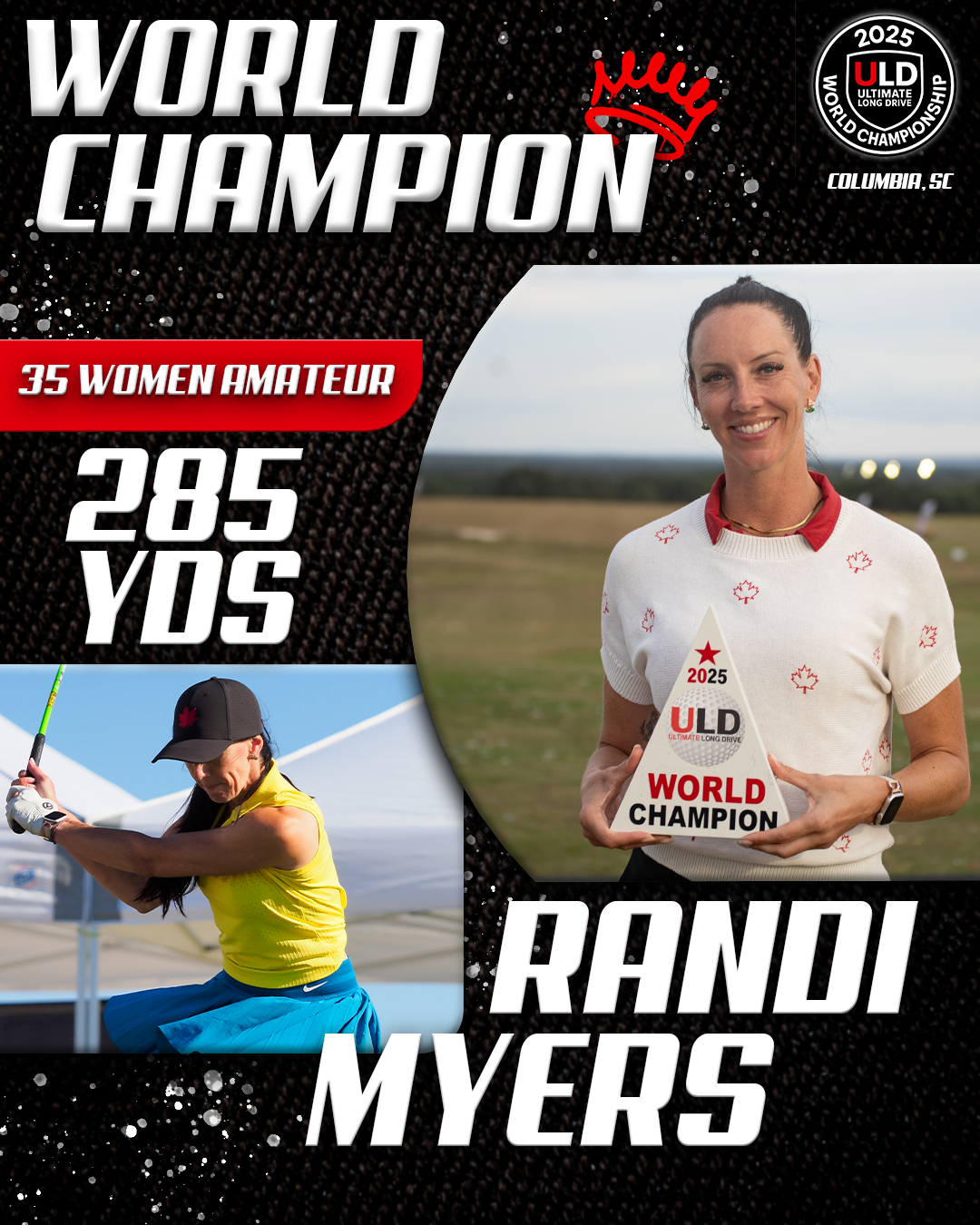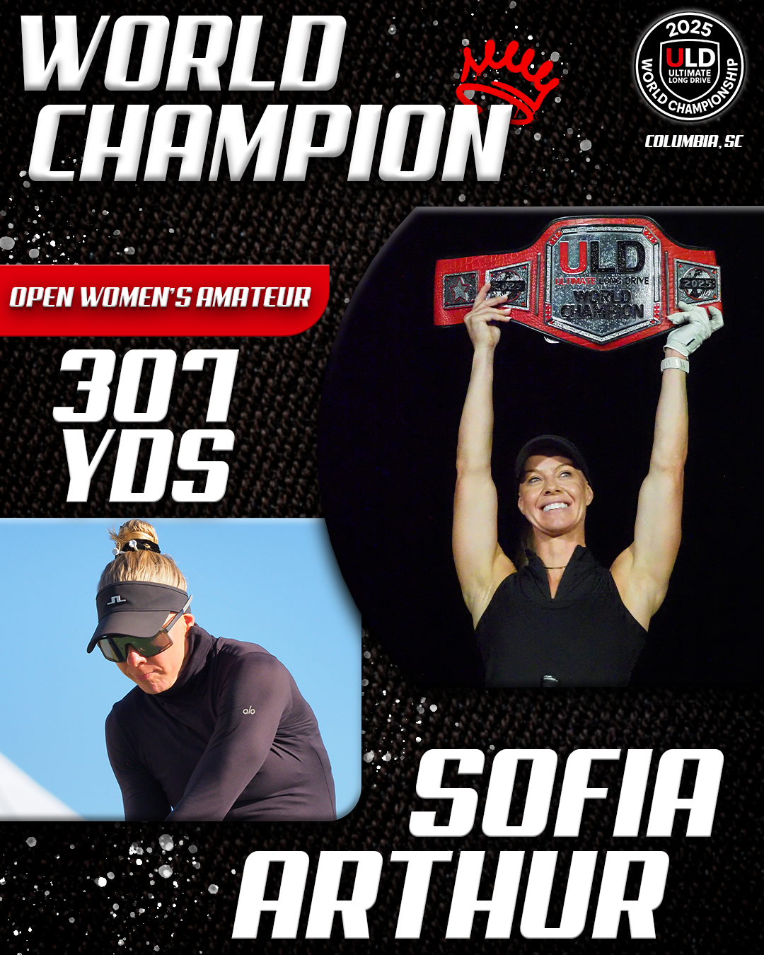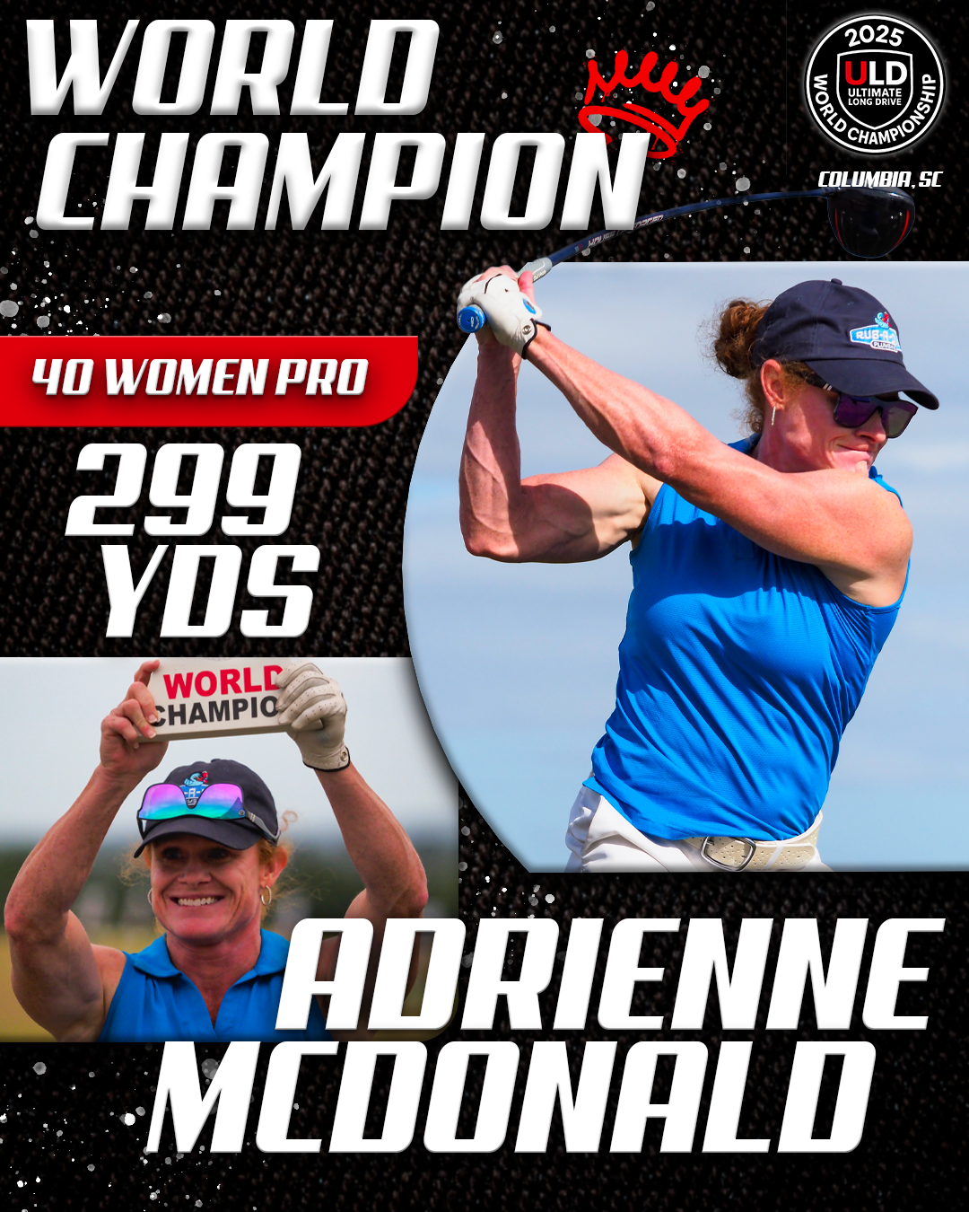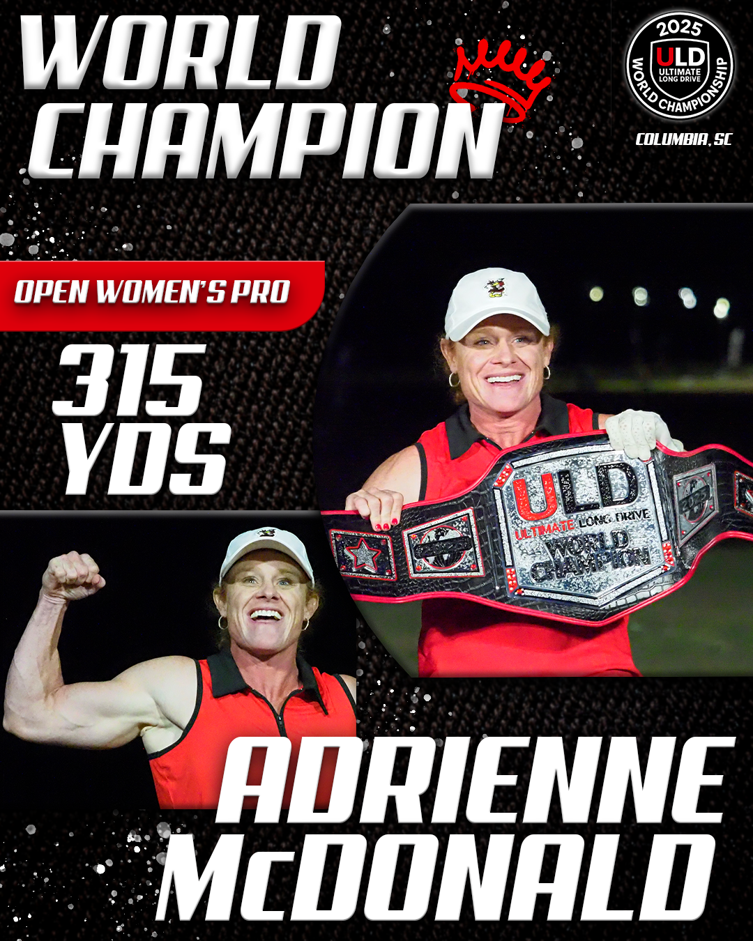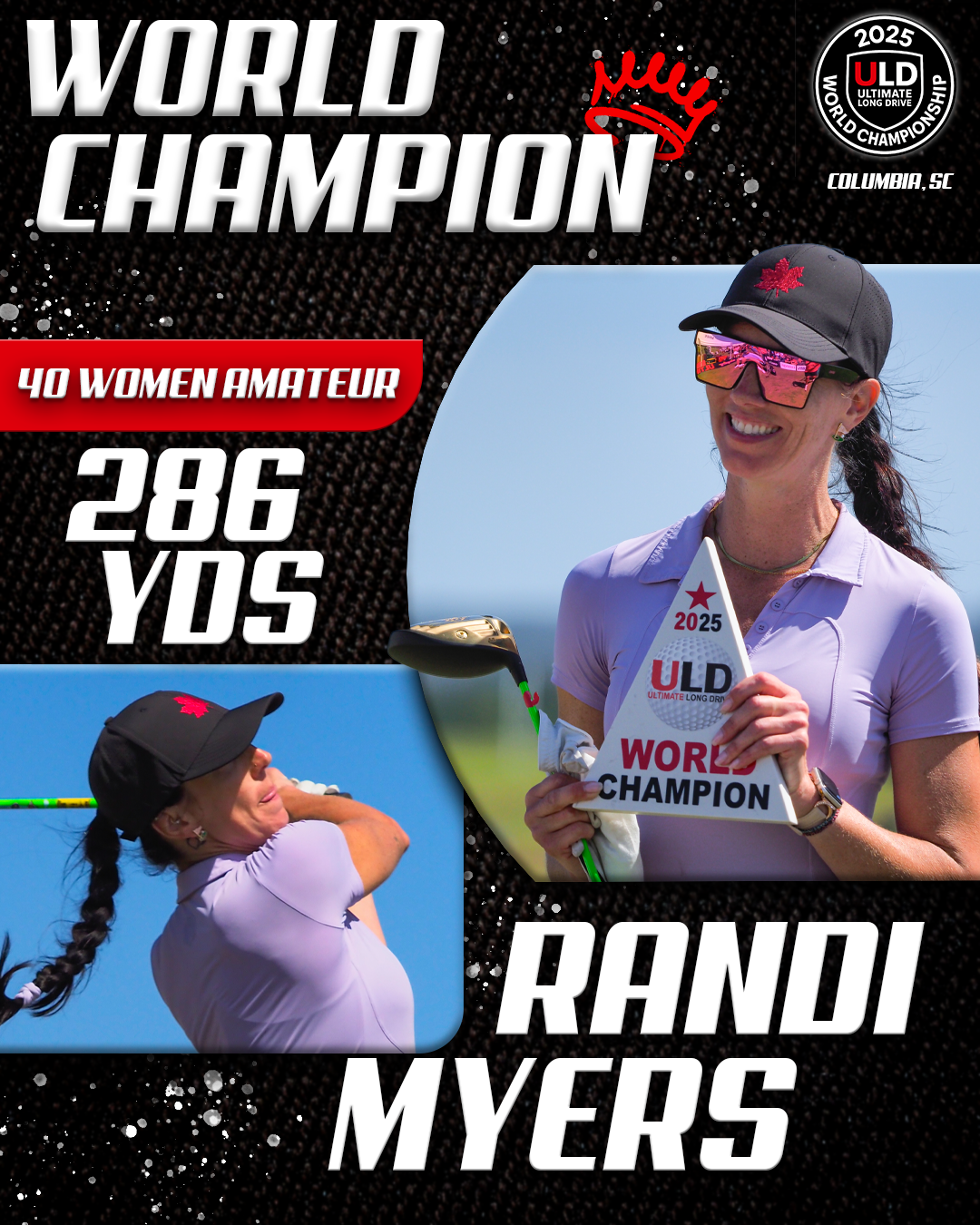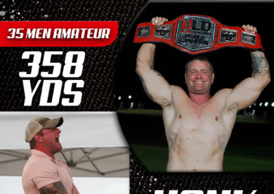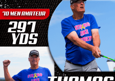 Returning to the backyard of her college golf days, University of South Carolina alumna Adrienne McDonald claimed victory in the Women’s Open Pro Division, topping Sofia Arthur in a memorable finish. Sofia won the ladies Open Amateur division. Jarret Myers, in his first year of long drive competition took the win in the Open Men’s Amateur division.