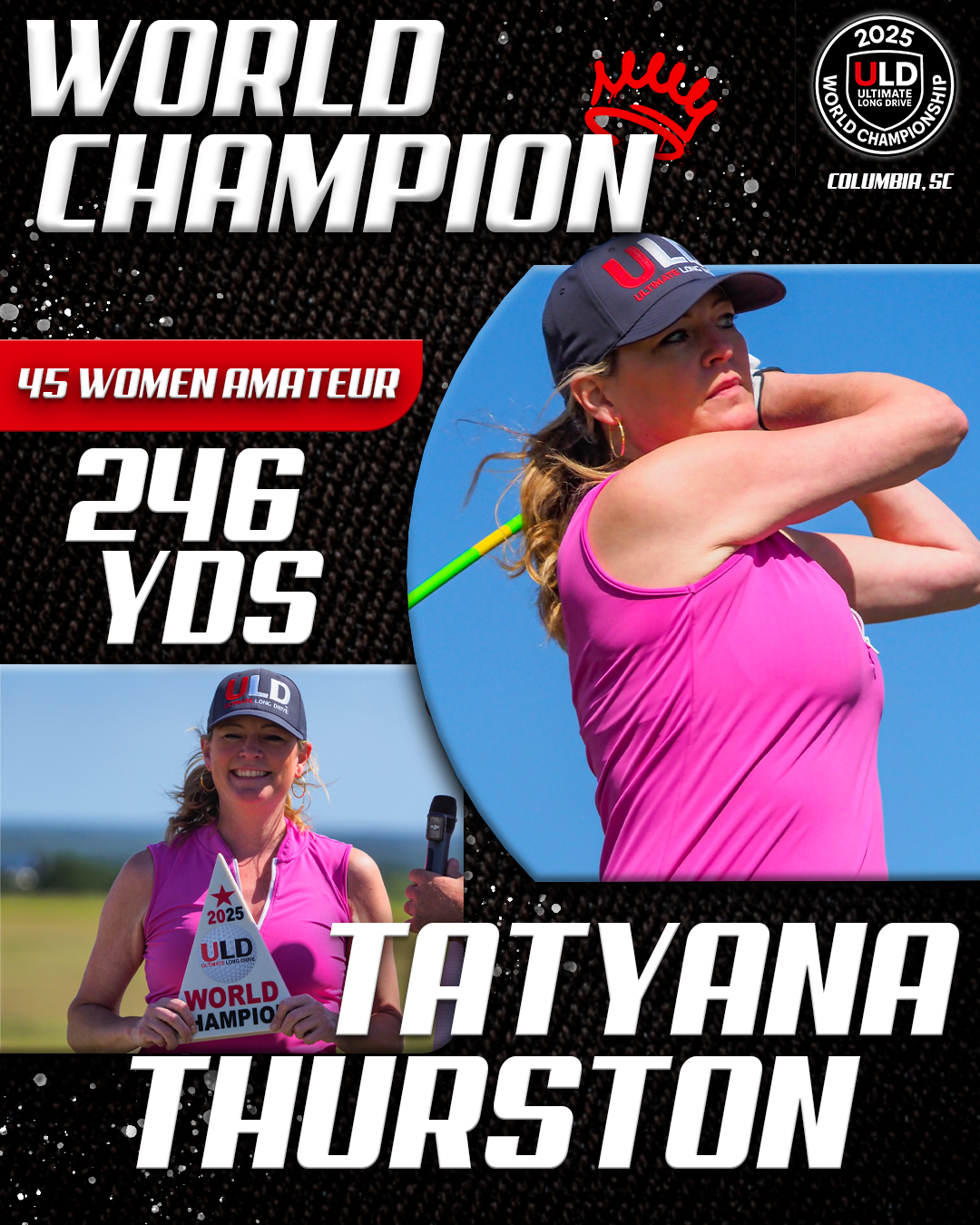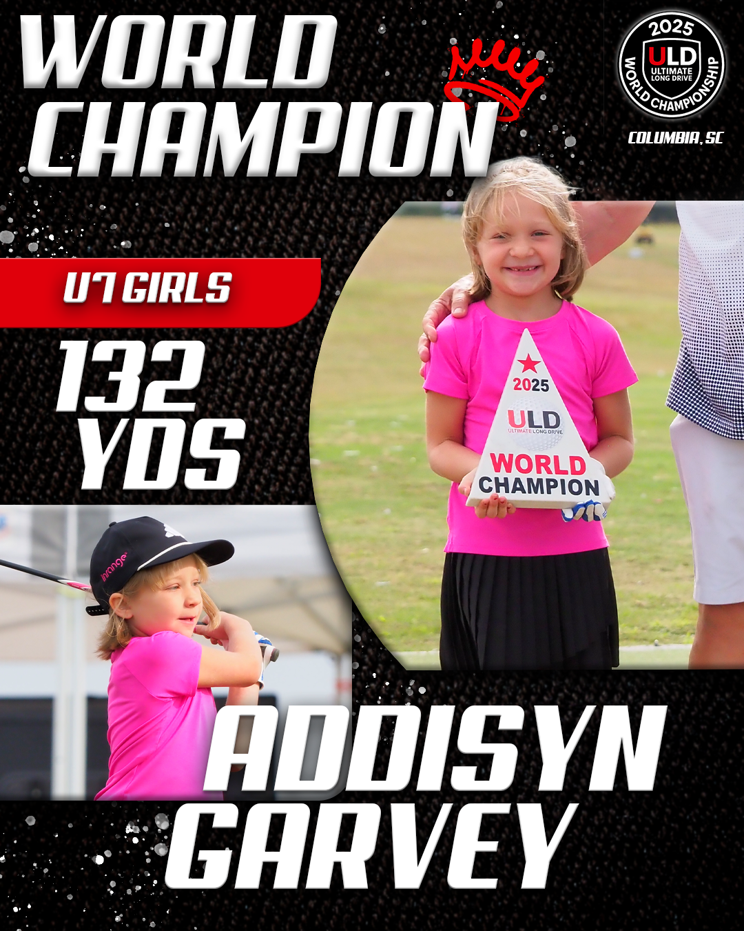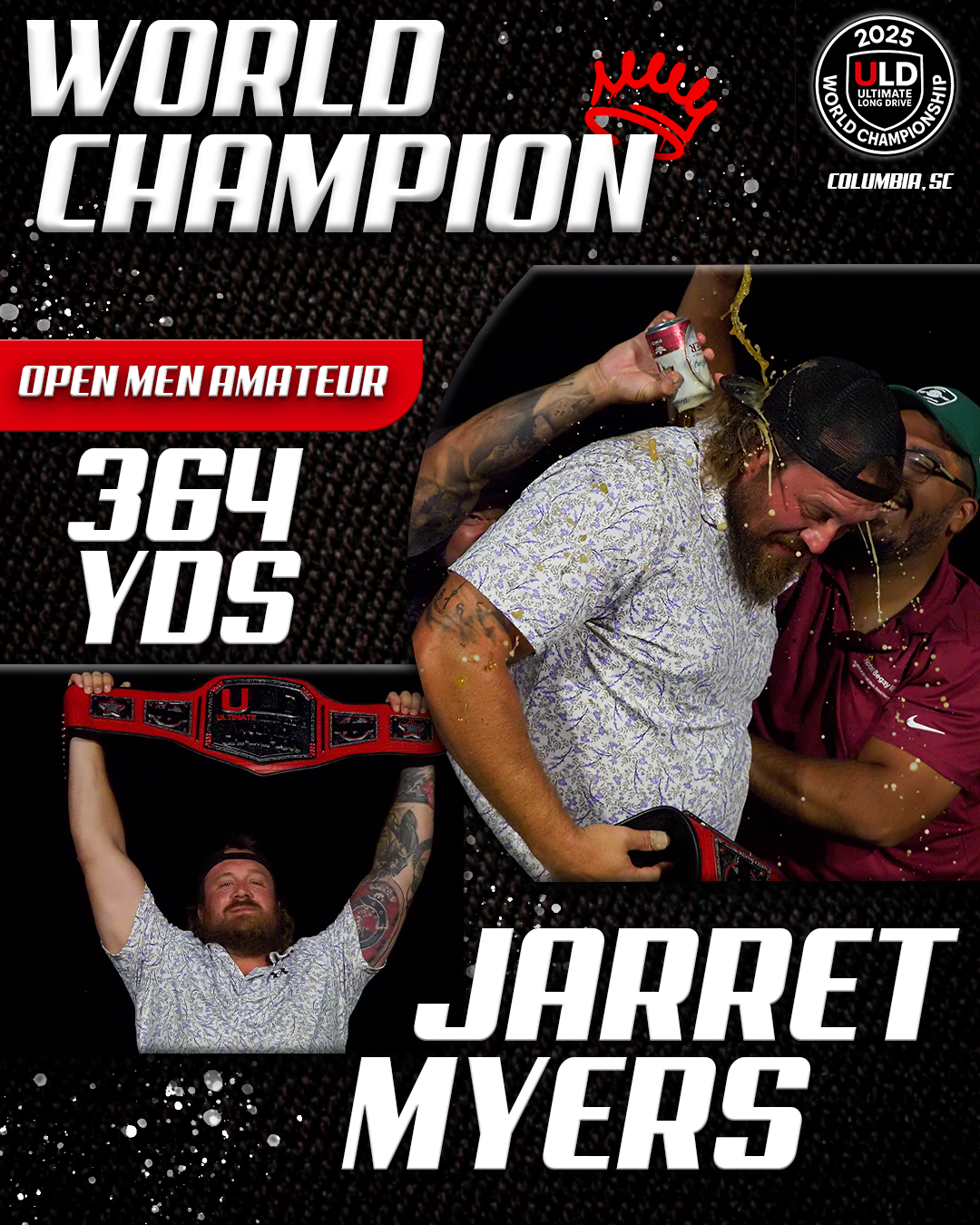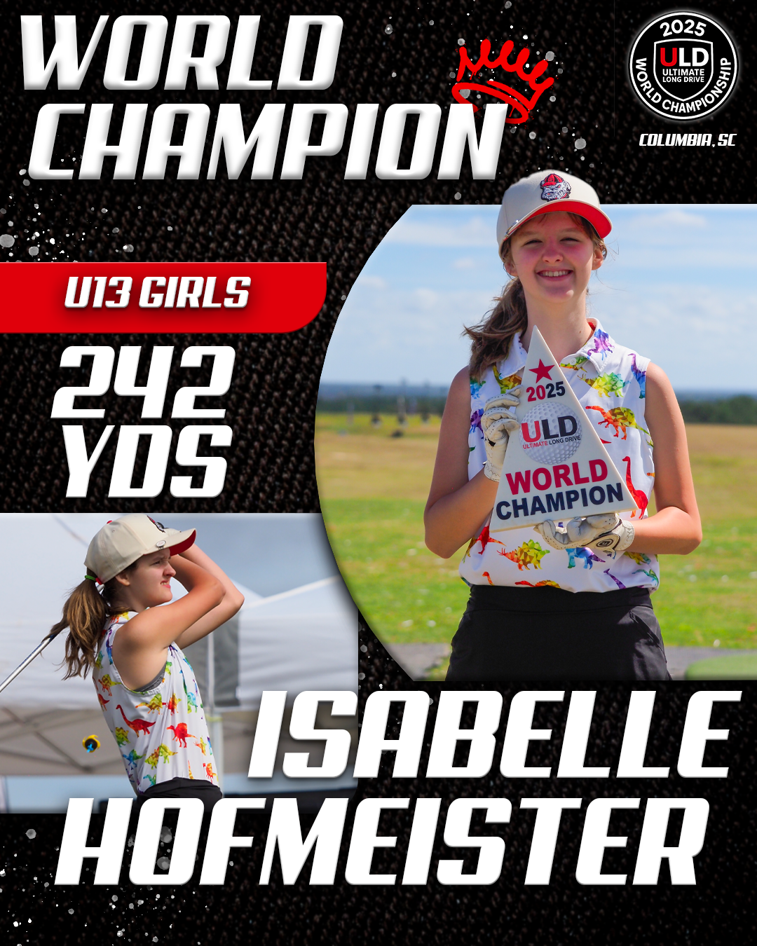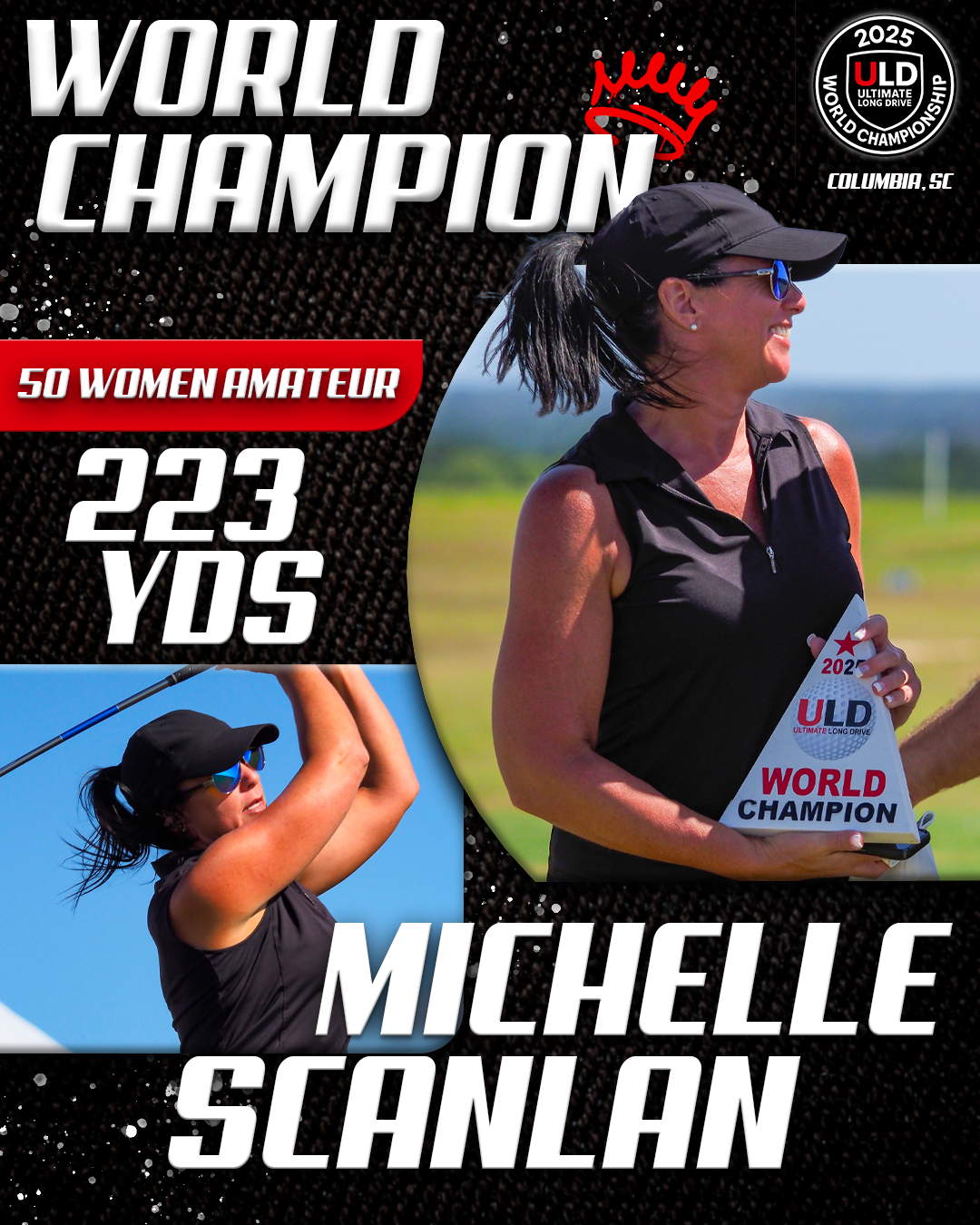 Returning to the backyard of her college golf days, University of South Carolina alumna Adrienne McDonald claimed victory in the Women’s Open Pro Division, topping Sofia Arthur in a memorable finish. Sofia won the ladies Open Amateur division. Jarret Myers, in his first year of long drive competition took the win in the Open Men’s Amateur division.